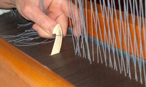 After threading through the eyes of the heddles, the warp threads once again are fed through the reed.
