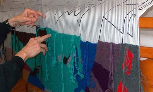I am now about one month into weaving the tapestry. Each of the different shapes on the cartoon is woven or “sculptured” by hand, one part at a time; the threads are set in place by packing by hand or by using a small hand beater.