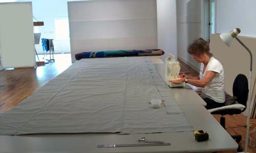 A cloth lining is made with pockets on the top for holding a flat aluminum bar for hanging the tapestry. The lining is first attached to the top on the back of the tapestry and then I sew with long, loose stitches in a zigzag pattern all over the tapestry, going through the lining and slightly into the tapestry itself. This distributes the lifting of the tapestry and makes it hang beautifully.