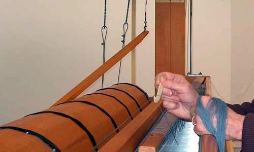 Each warp thread is now pulled through the dents in the reed and then attached to a rod that will be connected to flat, broad ribbons that will guide the warp onto the warp beam.