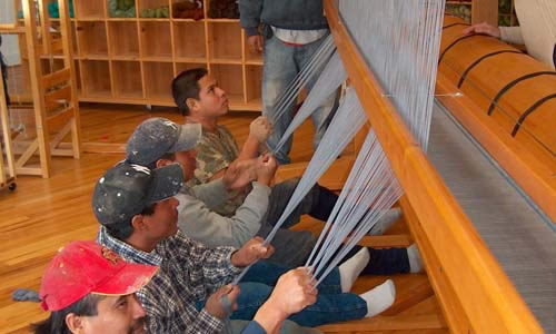 The “Warp Crew” holds the warp evenly while the warp is slowly rolled onto the warp beam on top of the loom. I make sure that everyone pulls with the same tension. If this is not done correctly, the tapestry will be uneven. When this is complete, the warp threads are pulled out of the reed and tied together in small bunches.