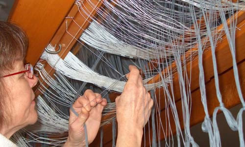 Now one warp thread is fed through the eye of each of the heddles which, in response to the movement of the foot treadles, will control the opening of the warp (when weaving-in the weft threads) and the closing of the warp (to keep the weft in place).